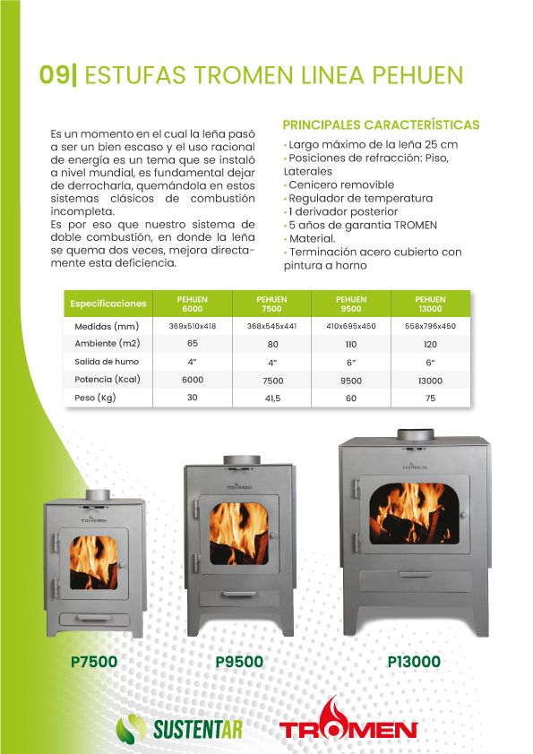 La Tromen Pehuen 7500 es una salamandra a leña que se usa para calefaccionar ambientes. Tiene una potencia de 7500 kcal/h y puede cubrir un área de hasta 80 m².