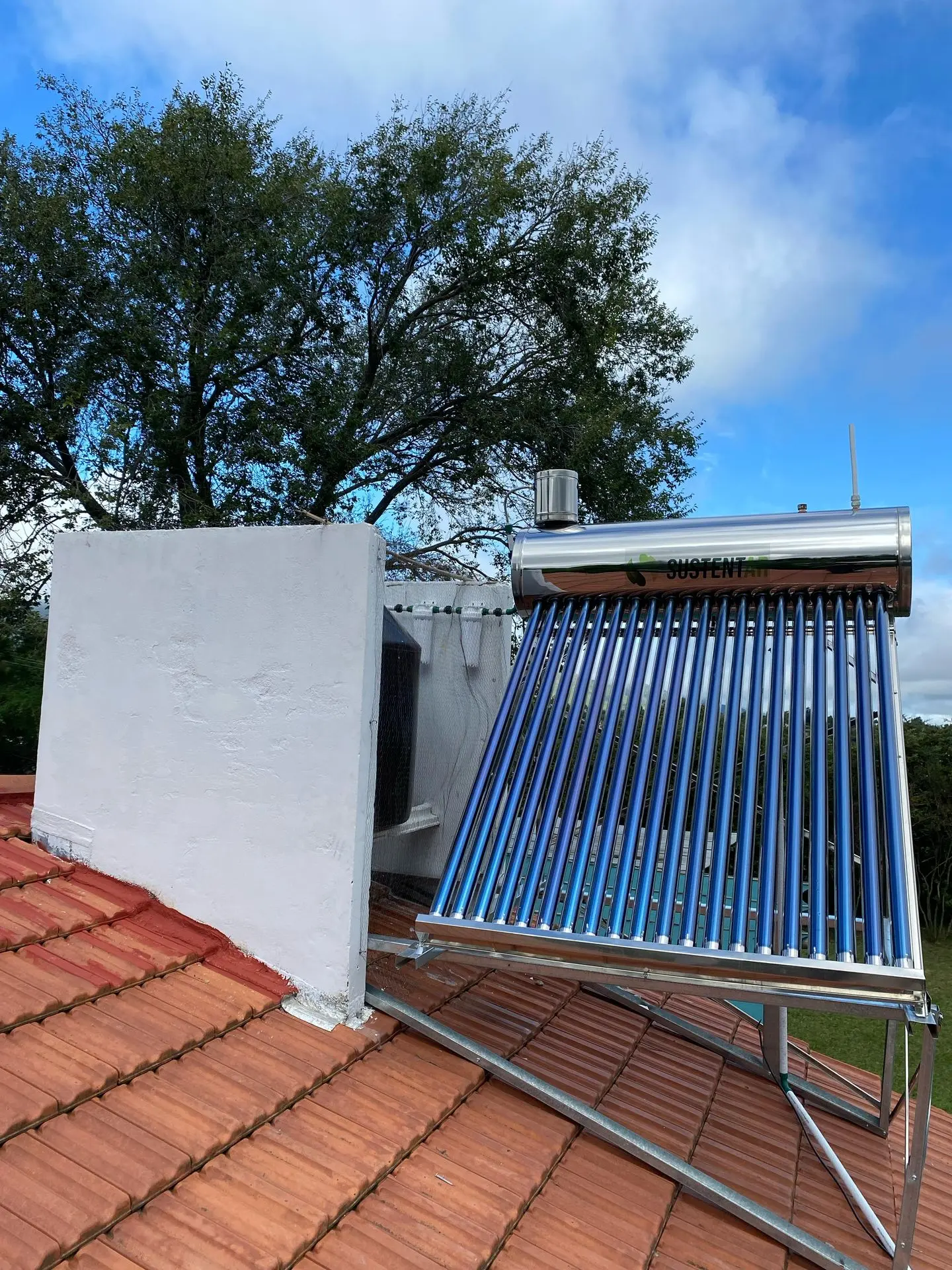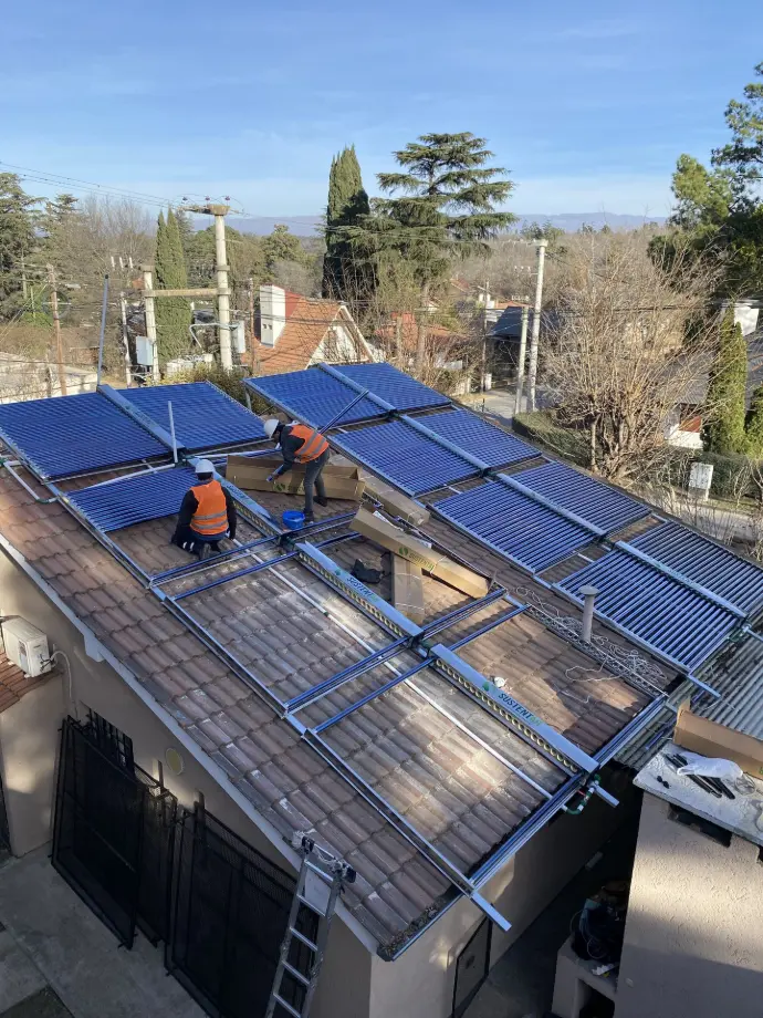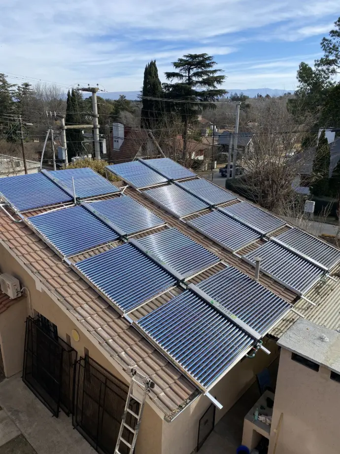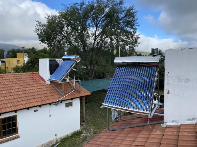 El termotanque solar de 200 litros se instalo en las Sierras de Cordoba en una vivienda estilo colonial a dos aguas. Debido a las caídas del techo eran hacia el este y el oeste se debió fabricar una estructura de nivelacion a medida.